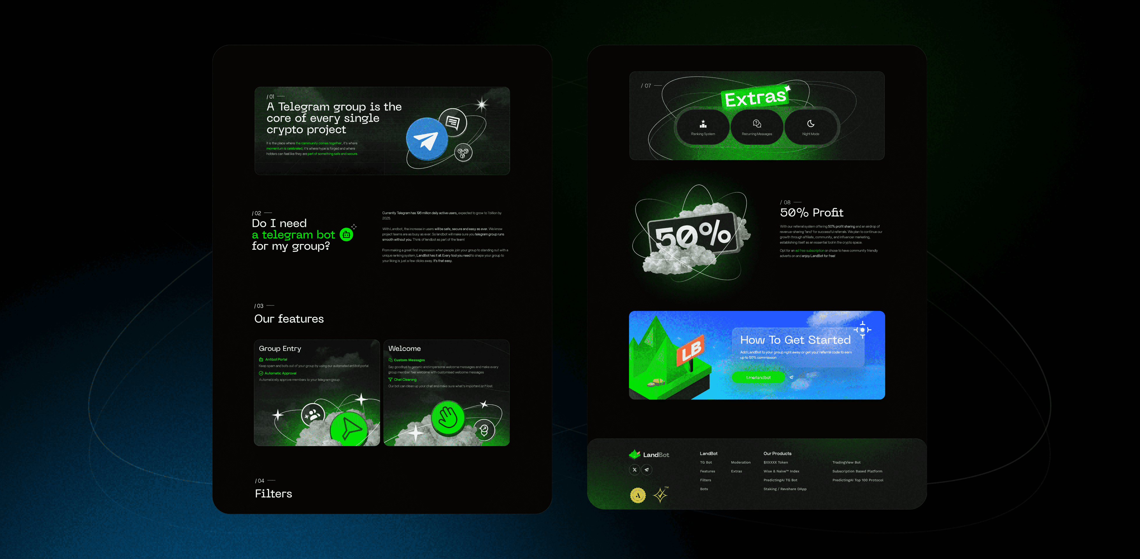 LandBot was envisioned as a playful yet powerful platform where communities can connect, trade, and grow together. By blending vibrant 3D visuals with intuitive interaction patterns, we created an ecosystem that transforms simple actions into memorable experiences. It’s not just about bots or NFTs — it’s about building a digital landscape where users feel at home and excited to return.
