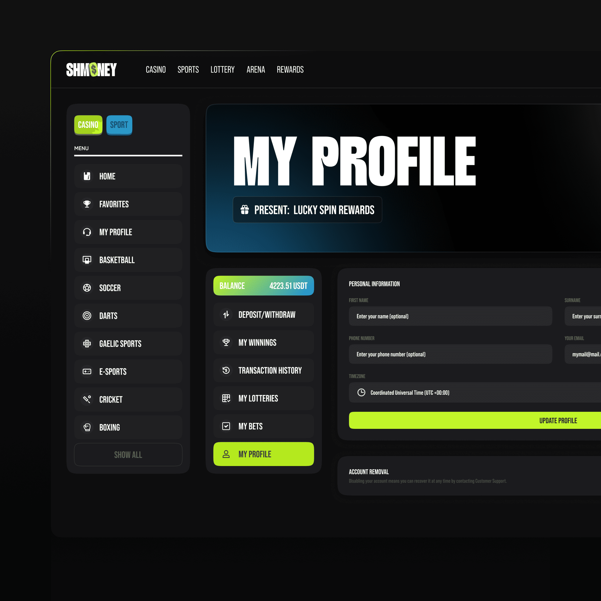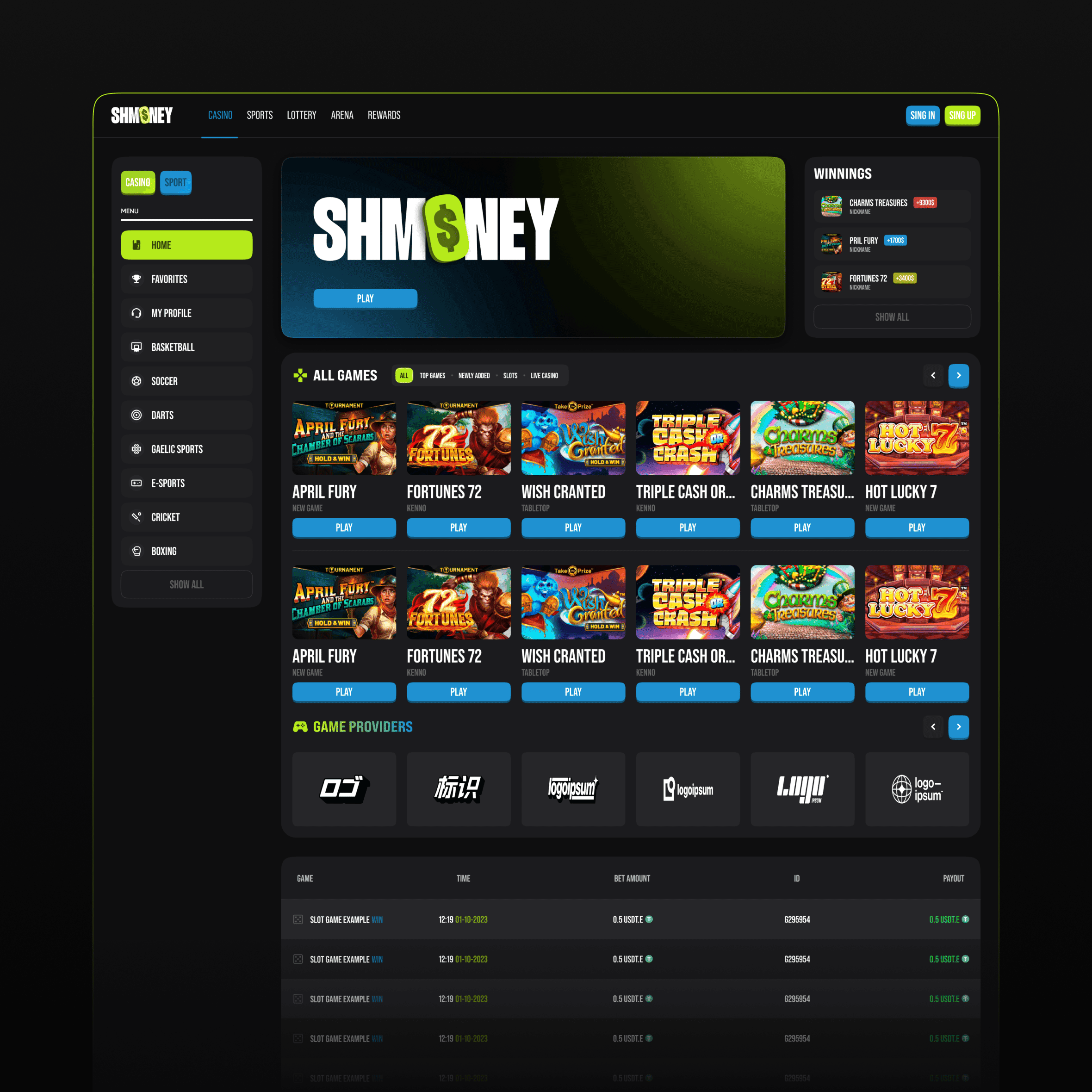 SHMONEY was created as a platform where users can explore games, manage their profiles, and track rewards with ease. Through a sharp, modern logo and a dark UI enhanced with vibrant accents, we designed a system that reflects both fun and reliability. SHMONEY is more than just a gaming platform — it’s a digital arena where entertainment and usability meet.