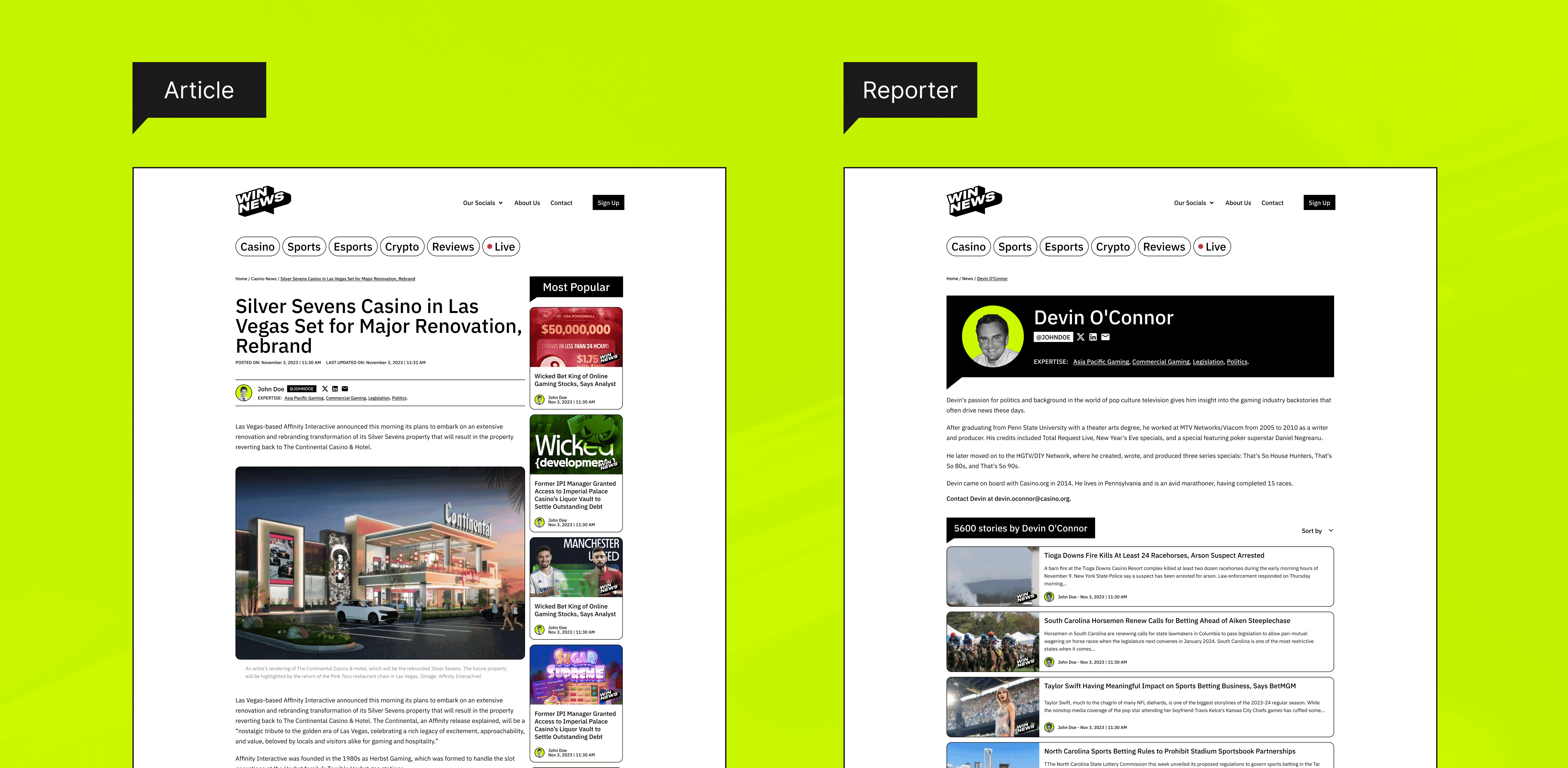 WIN NEWS is a bold media platform delivering fast and engaging coverage of the casino, sports, and crypto industries. With a striking neon identity and clean design system, it makes news easy to follow across web and mobile.